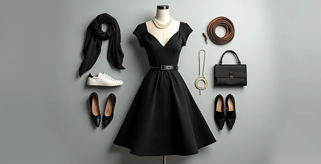 Die wahre Magie des kleinen Schwarzen liegt in seiner Fähigkeit zur Stil-Transformation. Es ist eine leere Leinwand, die durch die richtige Accessoire-Architektur komplett neue Identitäten annehmen kann. Es geht nicht darum, willkürlich Schmuck oder Schuhe hinzuzufügen, sondern darum, eine bewusste Komposition zu schaffen, die eine Geschichte erzählt. Betrachten Sie Ihr Kleid als die Basis und die Accessoires als die entscheidenden architektonischen Elemente, die den gesamten Charakter des „Gebäudes“ verändern.